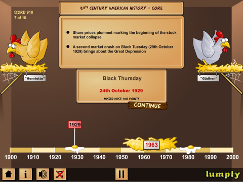 Playing this game is a super way to learn the chronology of key historical events. You will be shown the title of an historical event and your job is to click on the timeline to place a nest at the date the event took place. Our hens are History experts and they will fire their eggs towards the correct date. If your estimate is good the eggs will be caught in the nest. Get your estimate wrong and it all gets very messy.