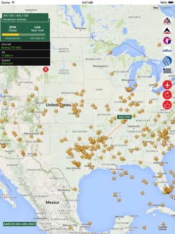 USA Tracker lets you view whole flights with 100% correct and instant information. And if you wish, you can push the airports button and switch to another one you want or you can select an airline and view their whole flights in the sky!