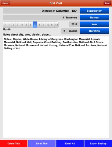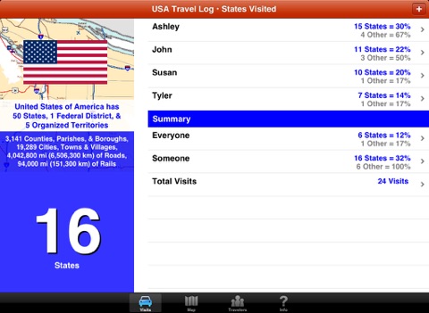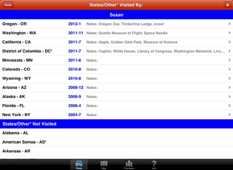 • The intent of this app is to keep track of US states and territories per each person. If you want to keep track of cities, counties, districts, regions, etc., you can input more text detail into any state visit.