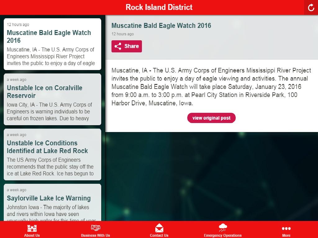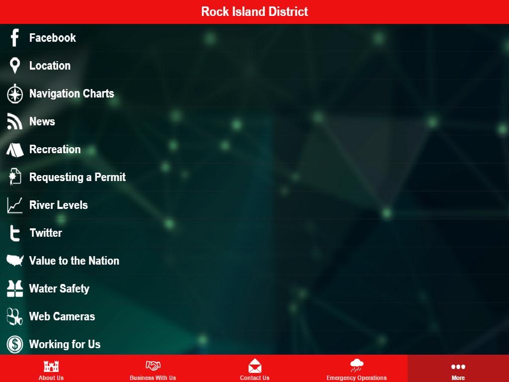 The USACE Rock Island app provides information about the U.S. Army Corps of Engineers Rock Island District including: business with us, contacting us, where to find us, emergency operations, social media connections, navigation charts, news, recreation, how to requesting a permit, river levels, water safety, web cameras and employment opportunities.