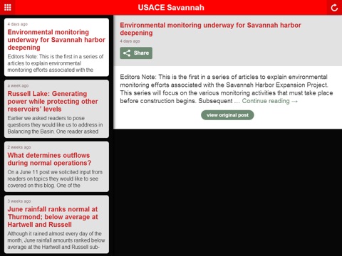 Official water management app for the U.S. Army Corps of Engineers, Savannah District. This app provides provisional rainfall and reservoir data, such as discharge, reservoir levels and projections, on the Corps-managed dams on the Savannah River: Hartwell, Richard B. Russell and J. Strom Thurmond.