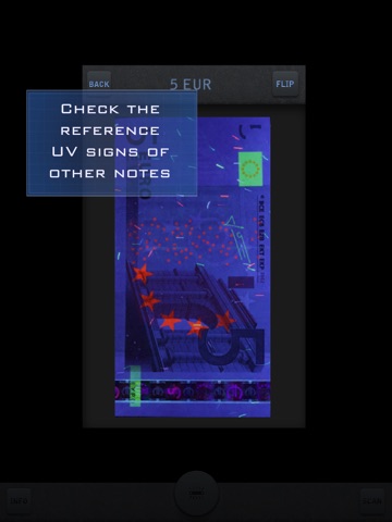 Point phone camera on a banknote, and turn on the UV lamp. You will see your note illuminated with hidden UV security signs. Next you can scan note to see where exactly UV securities are.