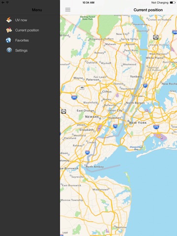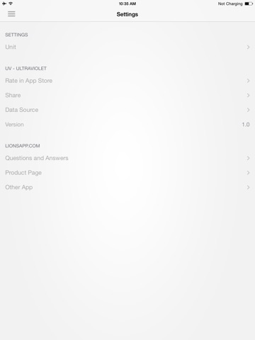 Make sure you have turned on your devices Location Services and are connected to the Internet. At this point the application will detect your geographical position. The display will show the name of the place and the value of the UV radiation, also indicating recommendations for the level of protection required.