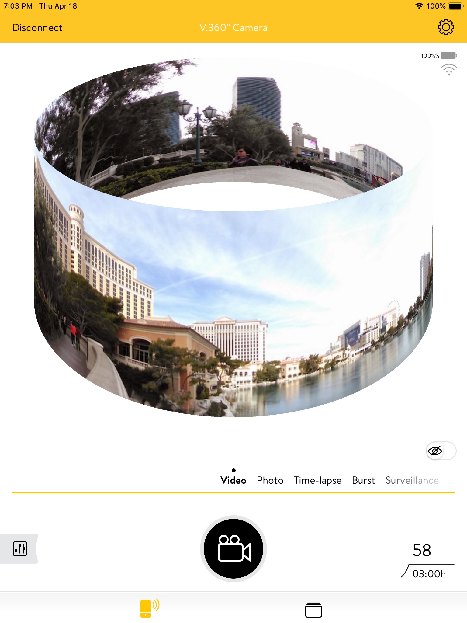 The V.360° Camera Application gives you full control of your V.360° camera from compatible iPhone® or iPad® device. With this easy to use app, you can see what your camera sees using the unique shotglass view finder or in traditional landscape viewing formats. Use the app to play back videos, view photos, and create video clips that can be shared via email, text, Facebook®, Instagram™, or other social networking applications. You can also setup your camera as a WiFi access point, allowing you to broadcast live to your friends straight from your V.360° camera.