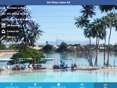 About Val Vista Lakes, Map of Val Vista Lakes, Val Vista Lakes Web Site, Coupons, Purchase or Refinance, VVL Homes for Sale, Search The MLS Real Time, QR Scanner, Contact Us, Call Us, Need an APP