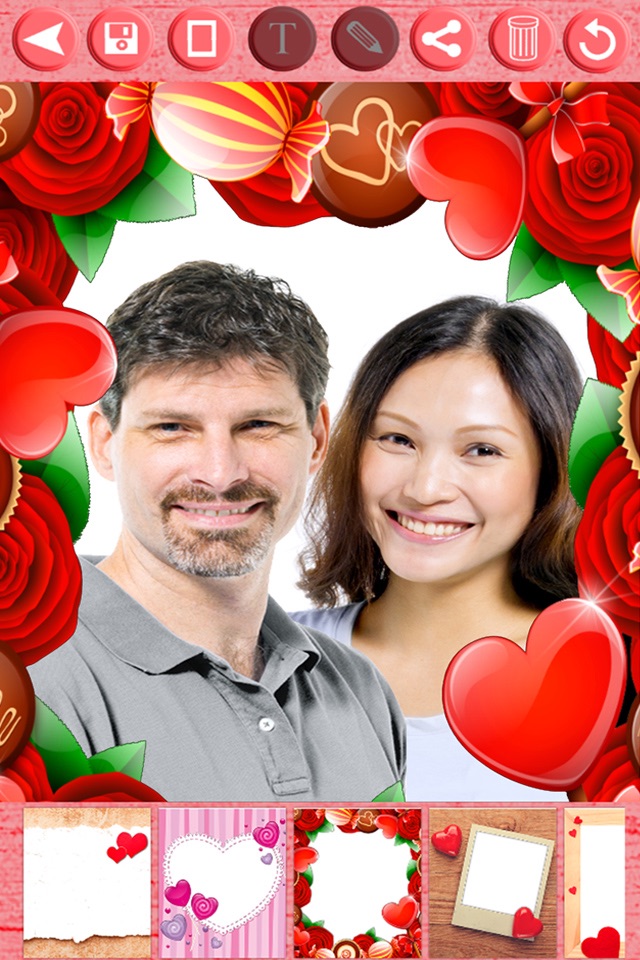 Choose photos from the gallery or take a picture with the camera and frame it in a nice love frame and make amazing collages or montages of photos. You can decorate your romantic love photos with your husband, boyfriend, lover or the guy you like to turn them into beautiful love pictures for love and romantic relationships.