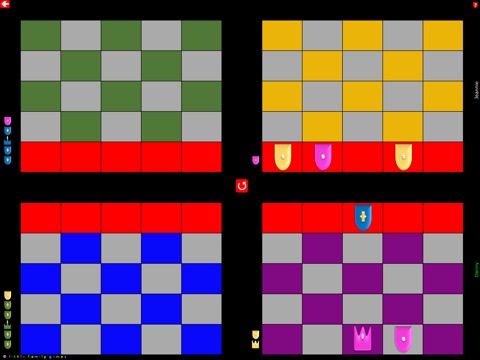 The board has four groups of blocks. The top two groups of blocks belong to your opponent, and the bottom two groups of blocks are yours. The handle of each player is shown to the right of the kingdom the player is defending. The name is green to indicate the players turn. At the top of each group of blocks is a set of red blocks. The red blocks are the gateways to the other kingdoms. You can enter another kingdom only when your game piece is on a red block which is explained in greater detail below. You will know your game pieces by their colors - note that you have two different colored game pieces. Push the refresh button to see your opponents move.
