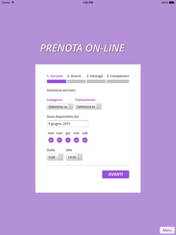 Grazie al calendario interno dellapp puoi verificare in ogni momento la disponibilità dei diversi trattamenti, ed effettuare subito la tua prenotazione. Dalla scheda "I miei appuntamenti" invece potrai visionare o annullare le prenotazioni già effettuate.