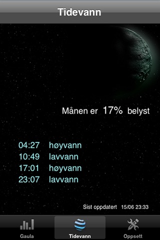 - Tidevann. Velg sted (målt tidevann) og offset å få oversikt over flo, fjære samt månefase (se skjermbilde)