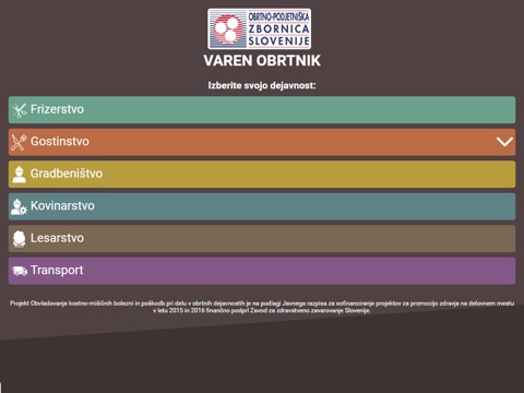 Aplikacijo Varen obrtnik je pripravila Obrtno-podjetniška zbornica Slovenije v sklopu projekta Obvladovanje kostno-mišičnih bolezni in poškodb pri delu v obrtnih dejavnostih.