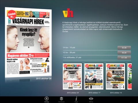 Az előfizetés az Ön iTunes account-ján keresztül történik. Az előfizetés automatikusan megújul, hacsak nincs ez az opció kikapcsolva legalább 24 órával az előfizetés lejárta előtt. Az előfizetés összege le lesz vonva az előfizetés lejárta előtti 24 órás időszakban. Az előfizetést kezelheti a felhasználó és az automatikus megújítást ki lehet kapcsolni a vásárlás után az Account Settings-ben. Már meglévő előfizetéstől nem lehet elállni az előfizetés ideje alatt. A mutatványszám ingyenesen elérhető, ugyanakkor az archívumban megvásárolható.