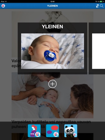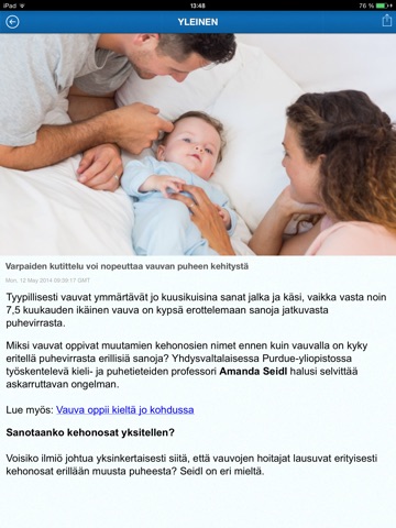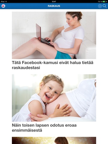 Vau.fi:n iPhonelle ja iPadille tehdyn sovelluksen avulla pääset lukemaan artikkeleita raskauden suunnittelusta, raskausajasta, lapsen kehityksen virstanpylväistä, kasvatuksesta, vanhemmuudesta, parisuhteesta, leikkimisestä, oppimisesta ja monesta muusta mielenkiintoisesta teemasta.