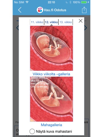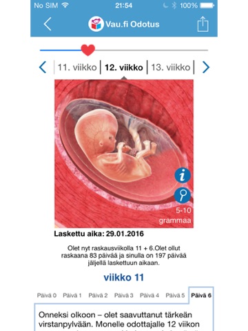 Jos olet raskaana, löydät sovelluksesta roppakaupalla tietoa raskauden jokaisesta viikosta. Miten sikiö kehittyy? Mitä muutoksia äidin kehossa tapahtuu? Raskausviikkojen tekstit ovat terveydenhuollon ammattilaisten tarkastamia. Viikkokohtaisen tiedon lisäksi löydät pienen, inspiroivan tekstinpätkän raskauden jokaiselle päivälle.