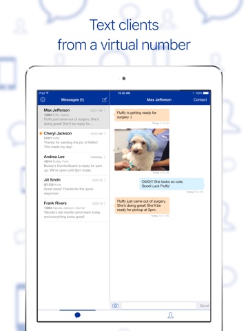 VCA Messenger is a messaging app that allows hospital staff to easily communicate with clients (1-to-1) via SMS about their pet’s health care and well-being.