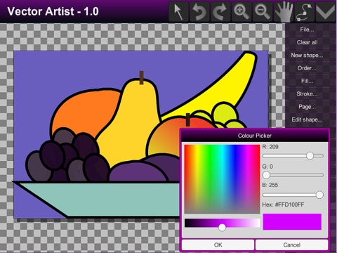 Create art with shapes and curves in this art program. Create art the way professionals do. Use standard shapes or "bezier" curves. Load SVG graphics to edit and modify.