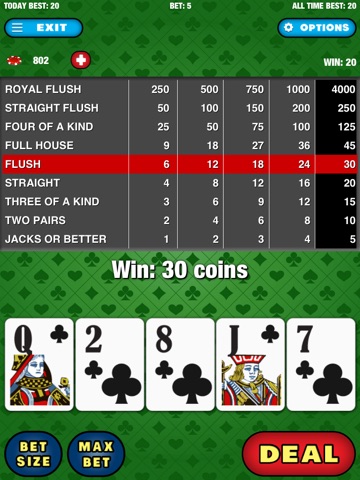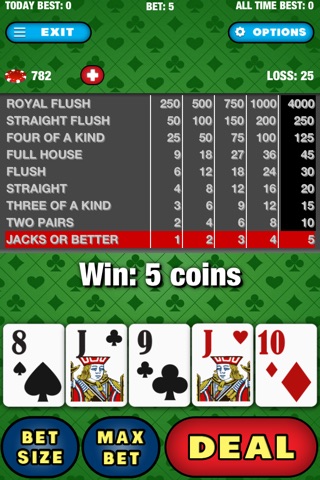 Practice your video poker strategy to win as many coins as possible! Play poker whenever you want!