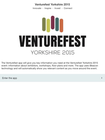 The Venturefest app will give you key information you need at the Venturefest Yorkshire 2015 event: information about exhibitors, workshops, floor plans and more. The app uses iBeacon technology and will automatically show you relevant content as you move around the event.