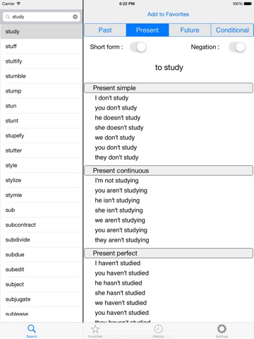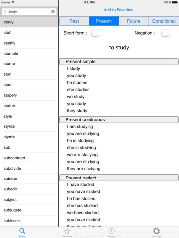 Hear the pronunciation of any conjugated form just by tapping on it. The app uses the text-to-speech functionality of IOS.