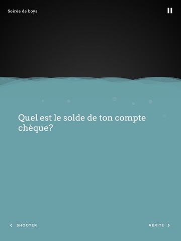 Tour à tour, répondez à des questions qui parfois vous feront rire et parfois vous donneront le goût de les éviter… en buvant un shooter. Serez-vous capable de résister et de répondre à toutes les questions? On en doute!