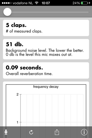 With the Vescom Acoustics Check app you can measure the acoustic properties of a room. By recording the clapping of your hands, the app calculates the room reverberation times and frequency response. The results will be shown in a report enhanced by graphics. You can share these results by email.