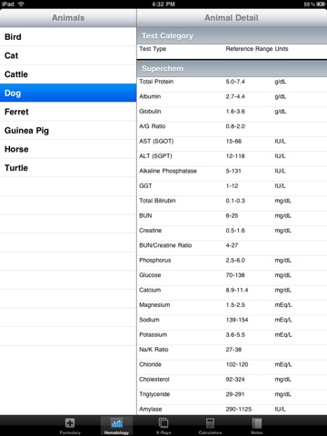 This app is a loss of money. Formulary only for dogs and cats. Only doses. Nothing on pharmacology, side effects... Blood parameters are a simple list. Impossible to change units. Etc. Better scan your notes. 1 Star because minus star impossible.
