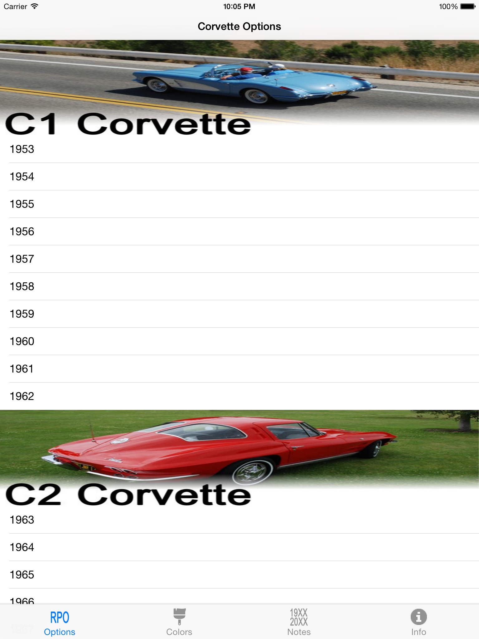 The Vette Options app has all the important statistics for the 1953 thru 2021 years of the Chevrolet Corvette. Included are options information (Code / RPO, price and production statistics) color information (exterior, interior and wheel colors, codes and production statistics) along with notes (available models and price data). This is a valuable resource for any Chevrolet Corvette enthusiast or car enthusiast.