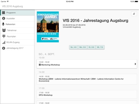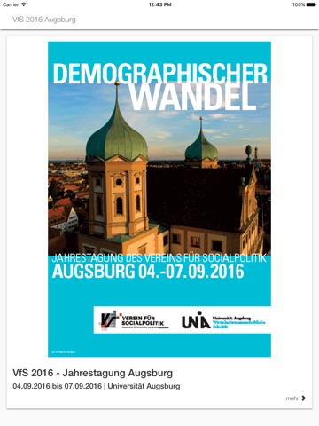 Die offizielle App zur Jahrestagung 2016 des Vereins für Socialpolitik vom 6. bis 9. September in Augsburg beinhaltet das gesamte wissenschaftliche Programm und das Rahmenprogramm der Tagung sowie zahlreiche nützliche Informationen für Ihre Anreise und Ihren Aufenthalt in Augsburg.