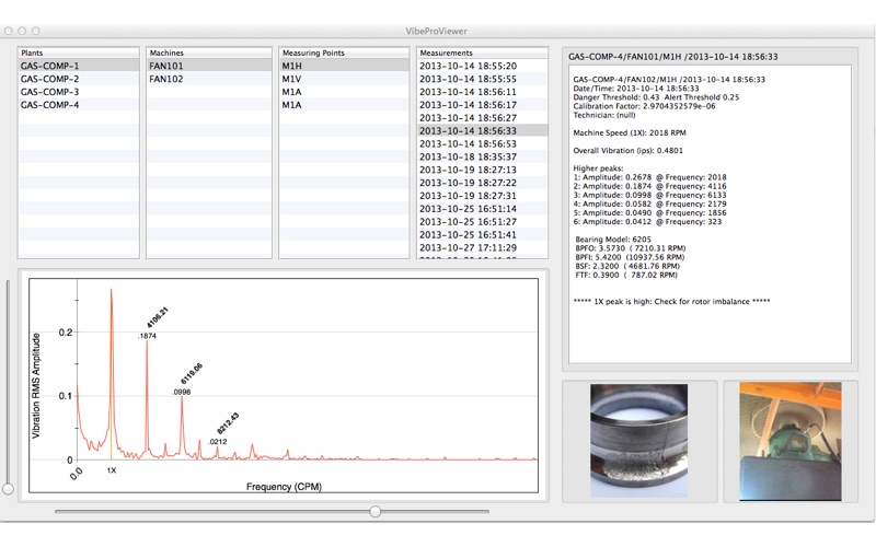 VibeProViewer is an industrial tool to visualize the vibration measurements stored in the database generated by the VibePro iPad App. All the data saved in the iPad can be exported to your Mac computer. View the Plants, Machines, Measuring Points and vibration Measurements, generate a report of all the readings, last readings and alert & danger readings. Plot the overall vibration trend for a measuring point of a specific machine and view the saved spectrum plots.