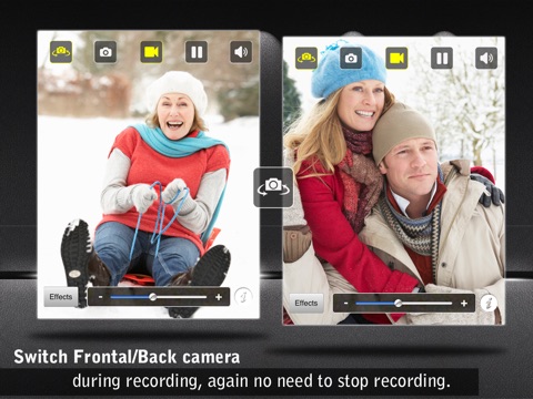 -Switch cameras DURING the video! No need to do all sorts of acrobatics just so you appear in the video... Just tap on the flipping icon to switch from front to back camera and viola!