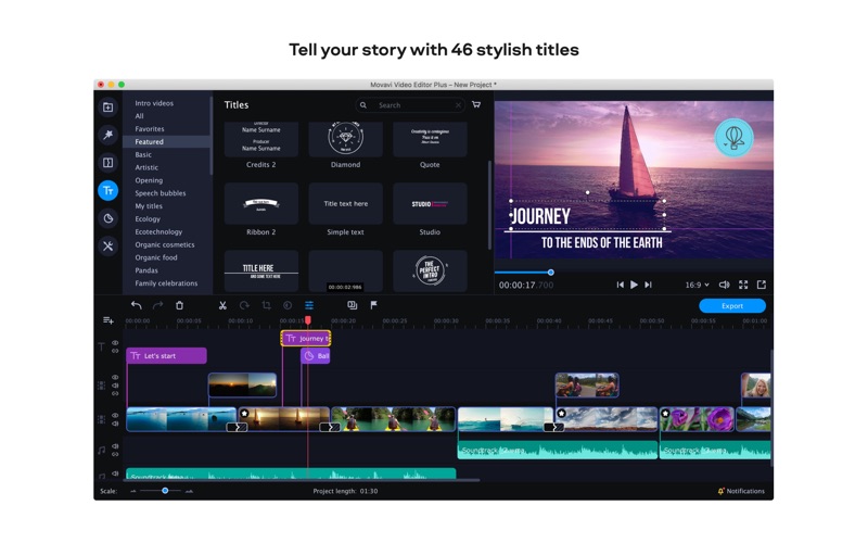 Enhance your videos with AI, add music or any audio, tons of titles, clips, effects, and filters.