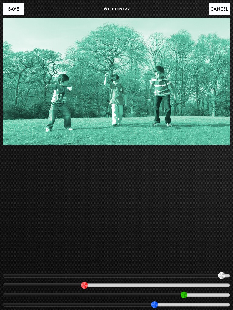 Video Effect Tool - Colorize Video Look app allows users to apply color special effects to their videos in the photo library. Users will be able to change the color composition of the recorded videos. Video Effect Tool app is really easy to use with very simple user interface. Users just have to select the video that they wanted to be filtered & apply the settings of color components red, green & blue values to the desired set points. While changing any of the values, a sample snapshot will be shown for easy setting.