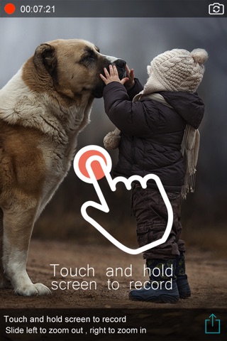 For recording your video just touch and hold any part of the screen and for pausing the video take your finger off the screen. You can continue recording your video by holding the screen again. Also, you can zoom in by moving your finger to the right, and zoom out by moving it to the left. You can save the video in your camera roll, send it by Messenger, WhatsApp and Mail, or share it to Facebook, YouTube, Instagram and WhatsApp by just one click. Devices Supported: iPhone 4S, 5, 5S, iPhone 6, 6+, iPhone 6S.