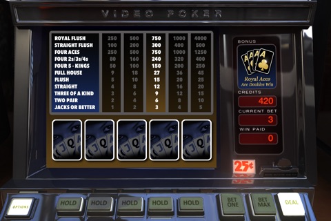 Play Video Poker Royal Aces on your iPad, iPhone or iPod Touch! Enjoy photo realistic slot machine graphics as you try for ultimate Royal Flush. This version of video poker puts a twist on the traditional Jacks or Better version by heavily weighting the 4 of kind payout. With 4 Aces your payout is in line with that of a Royal Flush!