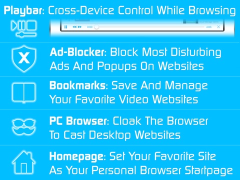 * Remote Playbar: A remote control that allows you to fast forward or rewind videos while browsing. It syncs across all your iPads & iPhones that are connected to the same Chromecast. So your video can be controlled by different users in the same room.