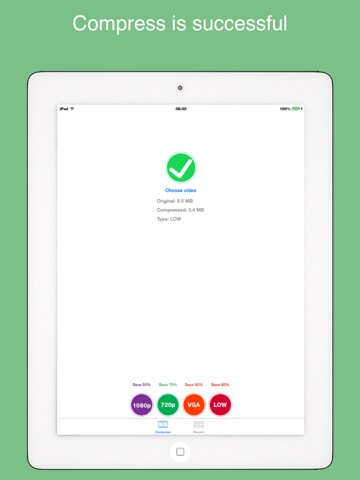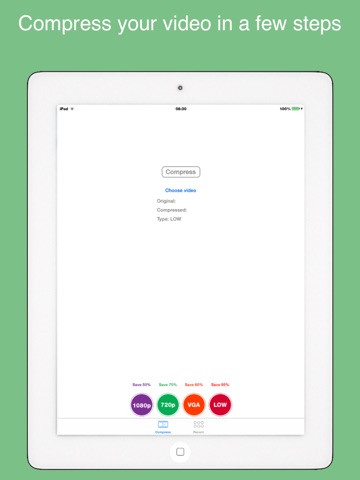 - Support to compress your video in many qualities: 1080p, 720p, VGA or Low quality