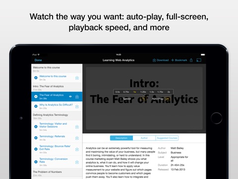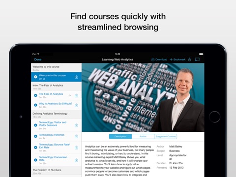 Jadore cette application, bien plus pratique pour moi de suivre une formation de mon iPad, confortablement installé plutôt que sur le PC. Parfois je fais les deux ^^ Jenlève tout de même une étoile, en effet il arrive parfois que les serveurs semblent "down" et impossible de faire quoique ce soit sur lapplication, comme cest le cas à lheure où jécris cet avis. Ça arrive parfois et ça ne dure jamais que quelques heures mais je le signale tout de même. En tout cas je répète, très jolie application, très ergonomique et bien pensée. Couplé à un abonnement mensuel, cest devenu pour moi une source dapprentissage personnel très importante.
