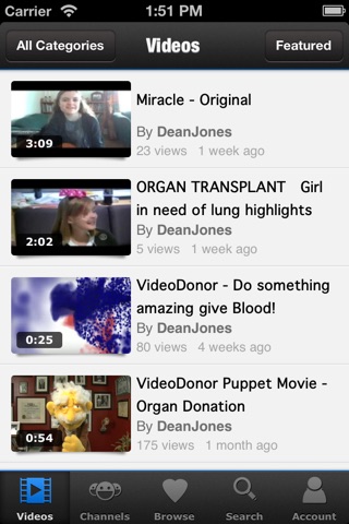 Videodonor.com has a variety of video selections including spotlight including organ donation videos, music videos, movies, comedy skits and videos intended to be inspirational.