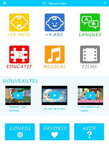 Avec lapplication "Vidéos pour Enfants", accédez à une sélection de vidéos de dessin animés sélectionnées et classées par catégories : +18 mois, +4ans, Langues, Educatif, Musical, Longue durée.