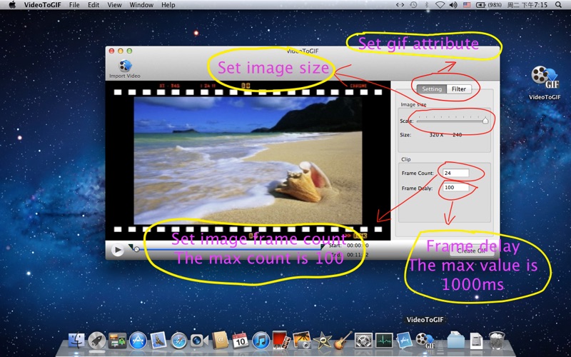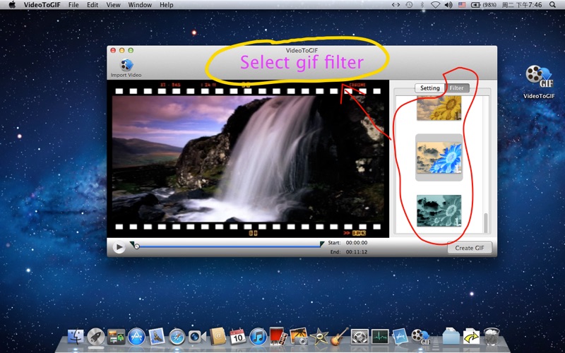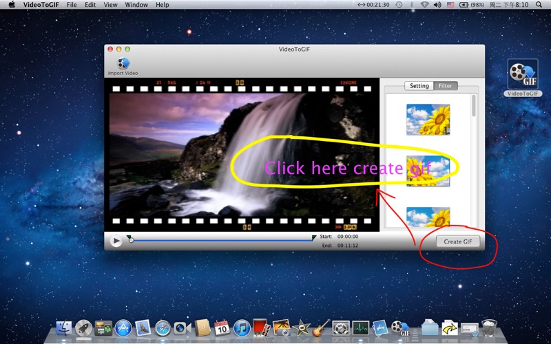 Make GIF picture from video.Can set start time and end time.Can set fps max 10 seconds,frame count 100.Can set filter for CIF picture