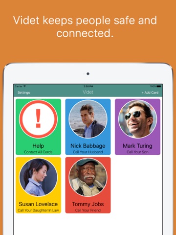 By tapping a card - a photo of somebody along with their name and relationship to the user - one can initiate a two-way FaceTime video call. With the Help card, a user can send all other cards a message that help is needed, along with a map of the users location. All of this can be accomplished in one tap, without a need to memorize phone numbers.