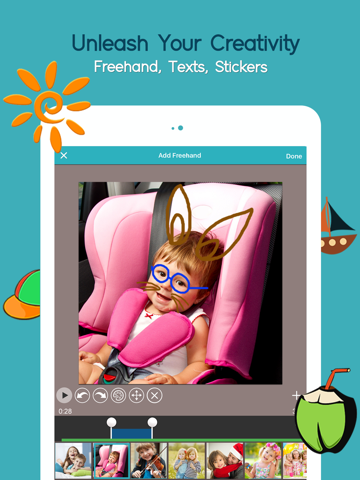 + STICKERS – Lots of categories to choose from like Emoji, Birthday’s etc. You can also resize, set orientation, position of your stickers.