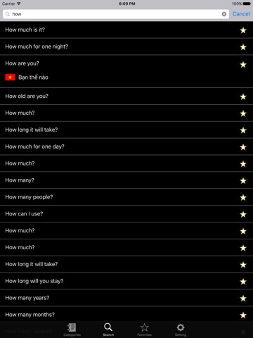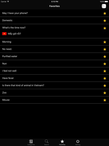 This app is a guide for travelling in Vietnam Language. This is intended for foreigners who are in Vietnam and to make good communication with Vietnamese people. Now there are about 1500 daily usages in English to Vietnam, Vietnam to English. Furthermore user can easily change setting for a language switch - English to Vietnam, Vietnam to English. Searching is also added here in order to search desired keywords in a short time.