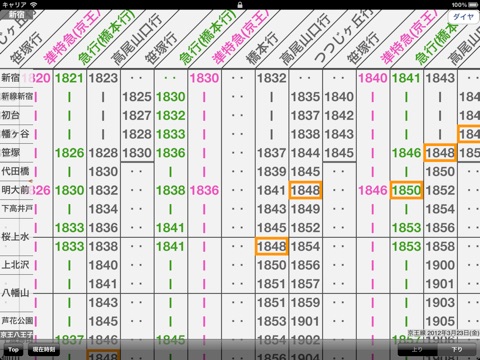 時刻表上では、現在時刻において次に停車する駅にオレンジの四角で囲まれています。