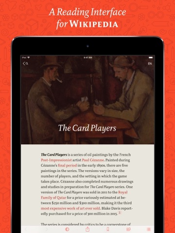 Endlich ein würdiger Nachfolger für das gute, alte "Articles". Ästhetisches, detailverliebtes Interface und ausgefeilte Typographie. Auf so einen Wikipedia-Reader habe ich lange gewartet. So macht Lesen Spaß!