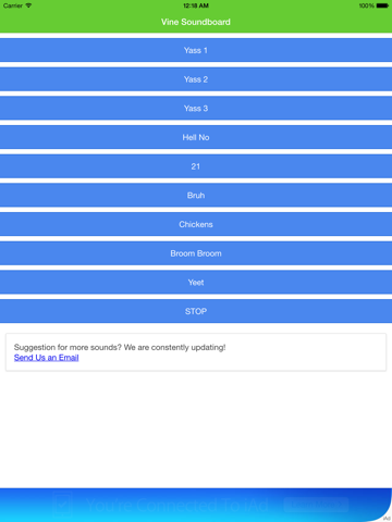 Play your favorite sounds from your favorite vines! Many sounds are included. Best part this app is free! Want a new sound? Feel free to suggest it! This is THE Vine Soundboard to have! This FREE Vine soundboard has famous vine quotes Like "Bruh".