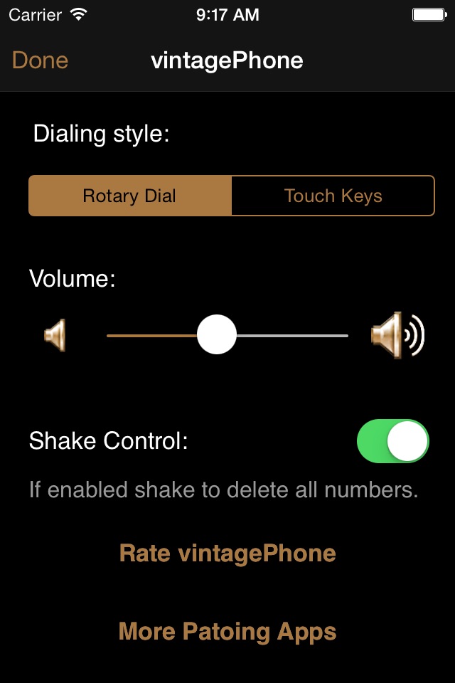 Settings allow for volume control of sound effects, and for the hurried - a touch tone feature for faster dialing. Here you can also disable the shake control to delete numbers.