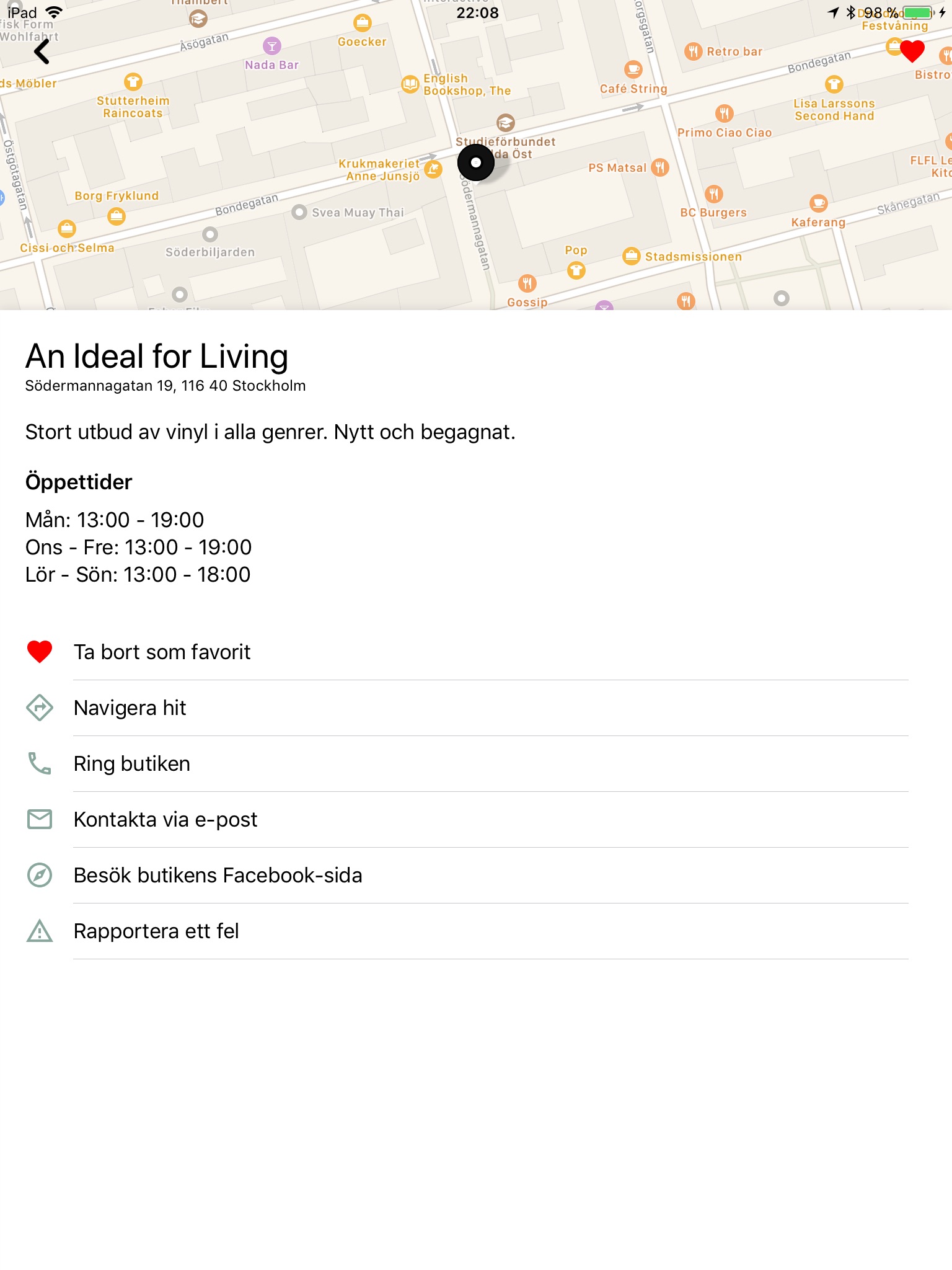 Därför har vi sjösatt en app där ni kommer kunna hitta all nödvändig info om Sveriges alla fantastiska skivaffärer, som t.ex. var de finns, när de har öppet och vad de är specialiserade på. Du kan även ringa och navigera till butikerna direkt från appen.