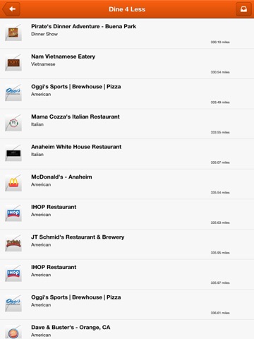 - Map/list that geolocates you to the closest participating VIP Dine 4Less Card venues and offers