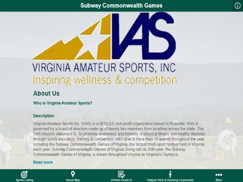 Virginia Amateur Sports, Organizers of the Subway Commonwealth Games and several other events, wanted to provide easy access to many of the high traffic areas of our website. Find access to the Google Map featuring all of the venues, restaurant guide, sports information, events calendar and more all in your hand.