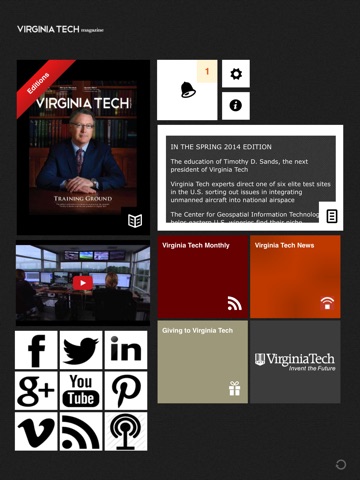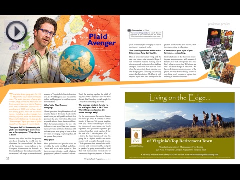Virginia Tech Magazine, the universitys flagship publication, forges stronger relationships among alumni, donors, and friends of Virginia Tech. Through a rich array of feature stories, alumni profiles, and university and alumni news, the magazine highlights the vibrancy of a university positioned on the leading edge of technology, service, learning, research, and scholarship and showcases the achievements of alumni, faculty and staff, and students.